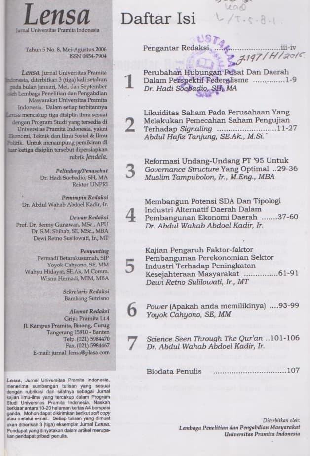 Lensa Jurnal Universitas Pramita Indonesia Tahun 5. Nomor 8. ( Mei - Agustus 2006 )