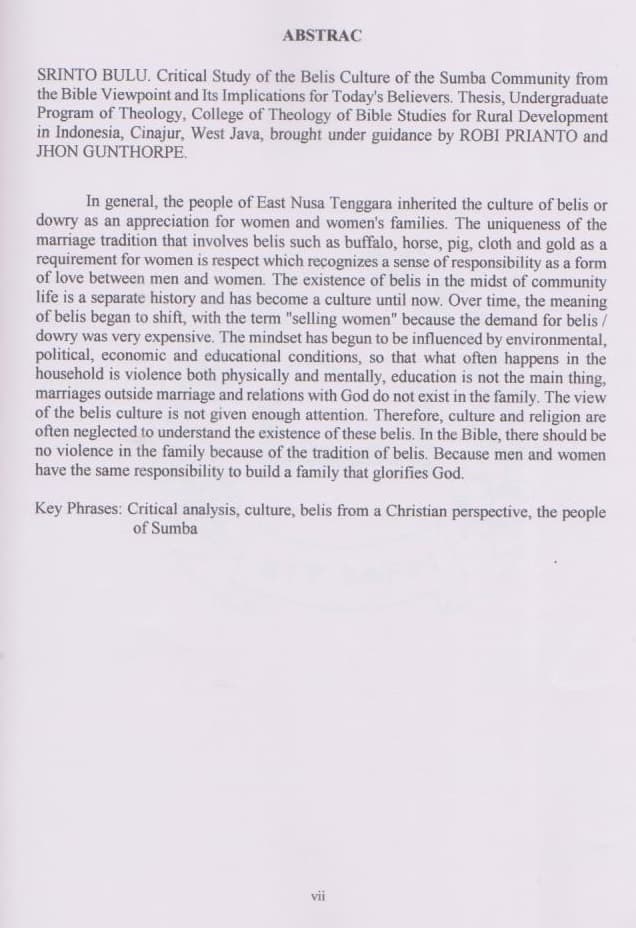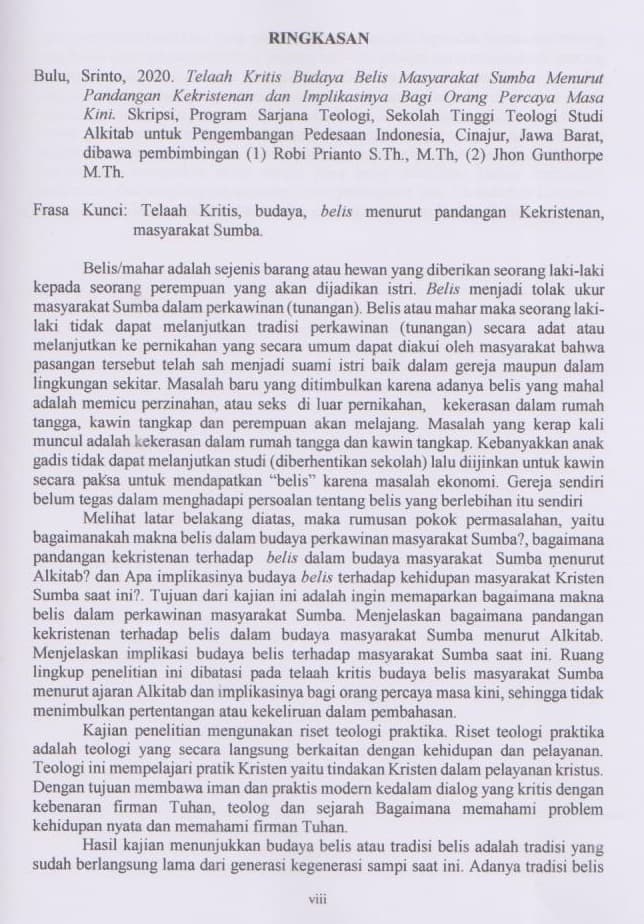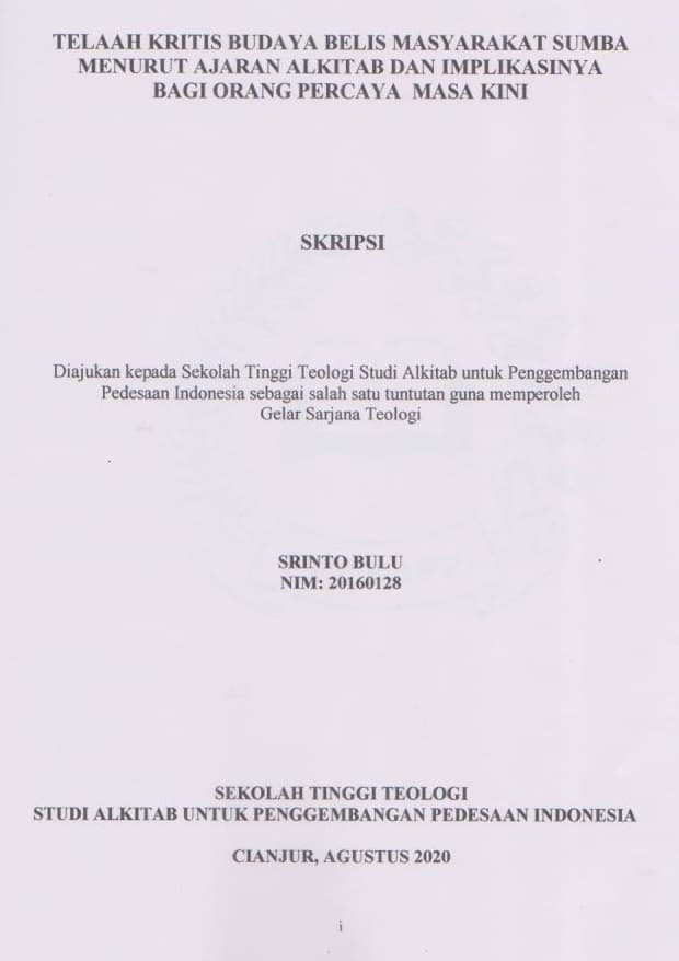 Telaah Kristis Budidaya Belis Masyarakat Sumba Menurut Ajaran Alkitab dan Implikasinya bagi Orang Percaya Masa Kini