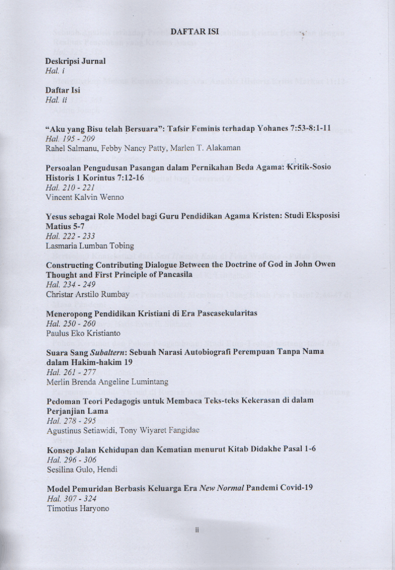 DUNAMIS: Terbit dua kali setahun pada bulan April dan Oktober yang memuat hasil penelitian maupun kajian konseptual dalam bidang Teologi dan Pendidikan Agama Kristen khususnya yang bernafaskan Injili Pentakosta. Artikel yang diterbitkan telah terlebih dahulu melalui tahapan double blind review oleh para ahli di bidangnya.