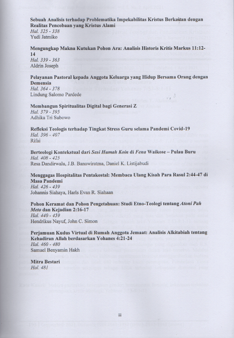 DUNAMIS, Volume 5, Nomor 2 { April 2021 } Jurnal Teologi dan Pendidikan Kristiani STT Intheos Surakarta