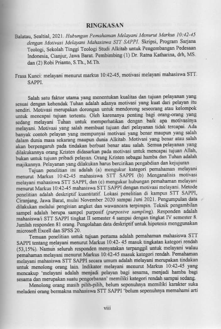 Hubungan Pemahaman Melayani Menurut Markus 10:42-45 dengan Motivasi Melayani Mahasiswa STT SAPPI