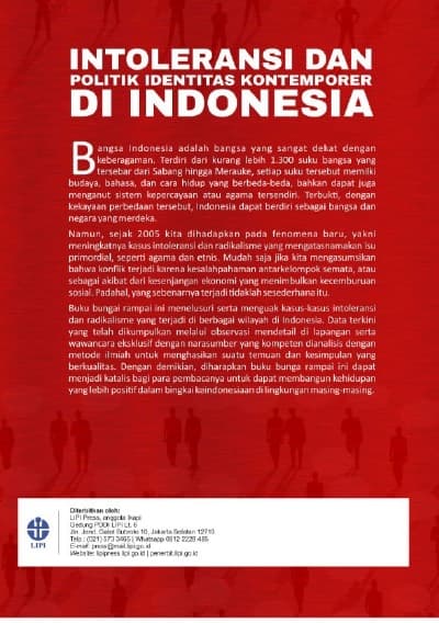Buku bunga rampai ini membahas mengenai berbagai perso-alan terkait peningkatan kasus intoleransi serta radikalisme agama dan etnis yang terjadi di Indonesia. Menguatnya konservatisme menjadi pemicu berkembangnya fenomena intoleransi yang tak jarang berujung pada radikalisme. Kami berharap bunga rampai ini dapat menjadi katalis bagi para pembacanya untuk dapat membangun kehidupan yang lebih positif dalam bingkai kein-donesiaan di lingkungan masing-masing