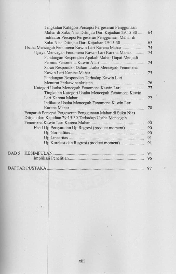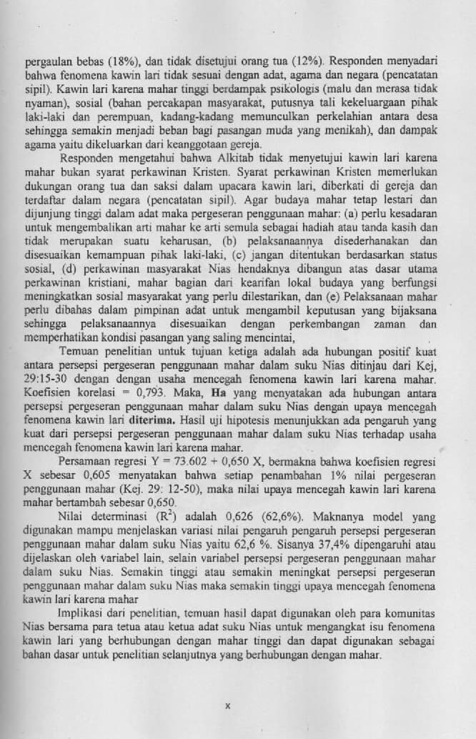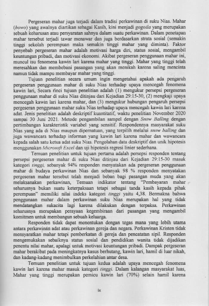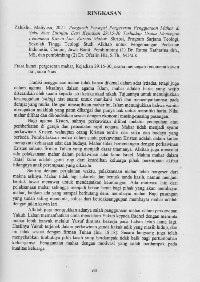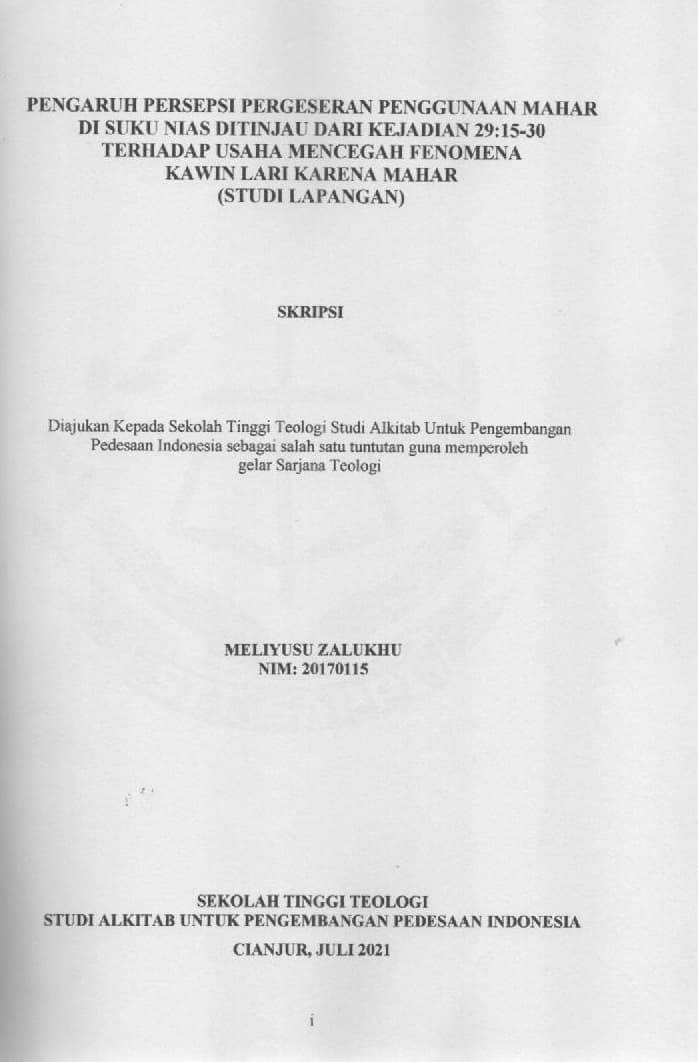 Pengaruh Persepsi Pergeseran Mahar di Suku Nias Ditinjau dari Kejadian 29:15-30 Terhadap Usaha Mencegah Fenomena Kawin Lari Karena Mahar (Studi Lapangan)