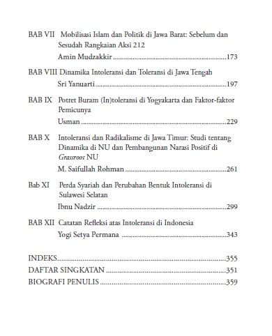 Buku bunga rampai ini membahas mengenai berbagai perso-alan terkait peningkatan kasus intoleransi serta radikalisme agama dan etnis yang terjadi di Indonesia. Menguatnya konservatisme menjadi pemicu berkembangnya fenomena intoleransi yang tak jarang berujung pada radikalisme. Kami berharap bunga rampai ini dapat menjadi katalis bagi para pembacanya untuk dapat membangun kehidupan yang lebih positif dalam bingkai kein-donesiaan di lingkungan masing-masing