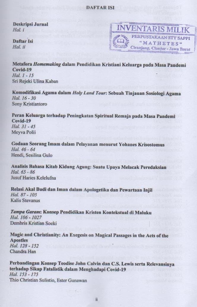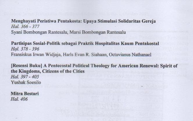 DUNAMIS: Terbit dua kali setahun pada bulan April dan Oktober yang memuat hasil penelitian maupun kajian konseptual dalam bidang Teologi dan Pendidikan Agama Kristen khususnya yang bernafaskan Injili Pentakosta. Artikel yang diterbitkan telah terlebih dahulu melalui tahapan double blind review oleh para ahli di bidangnya.