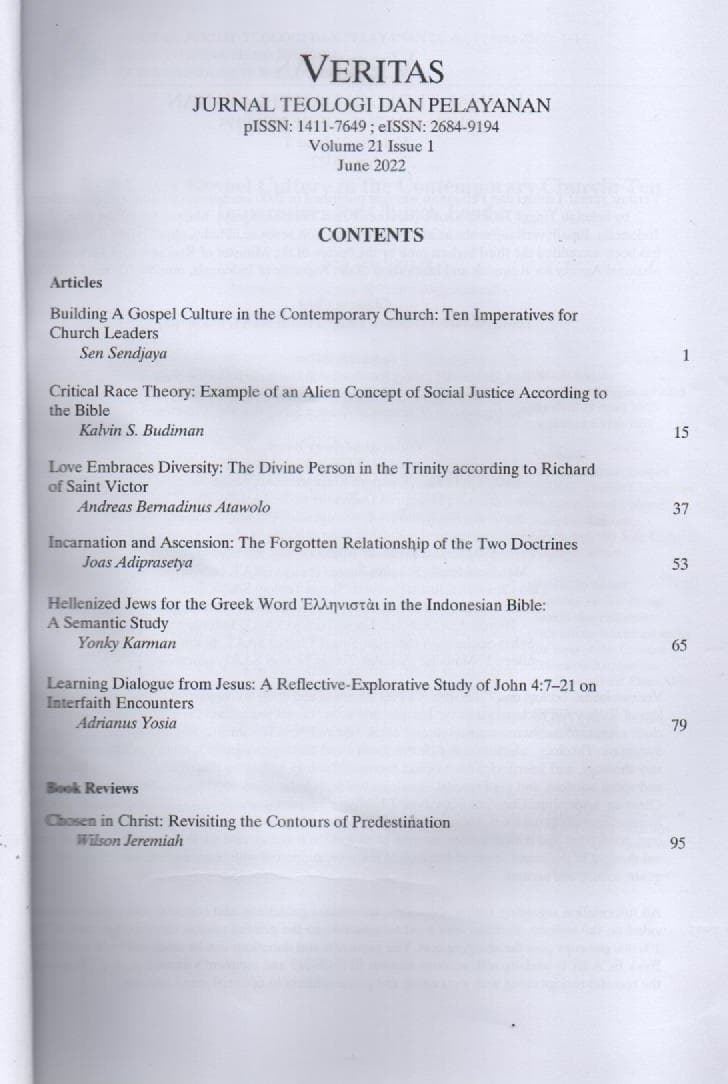 VERITAS ; Jurnal Teologi dan Pelayanan Volume 21 No. 1 ( Juni 2022 )