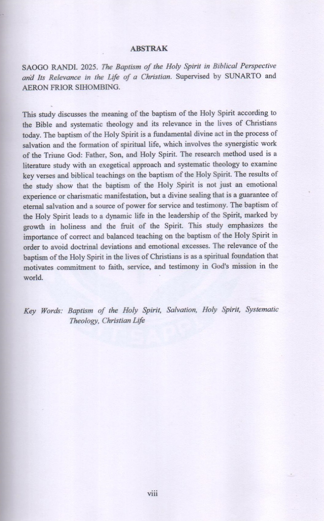 Baptisan Roh Kudus Dalam Prefektif Alkitab dan Relevansinya Dalam Kehidupan Orang Kristen